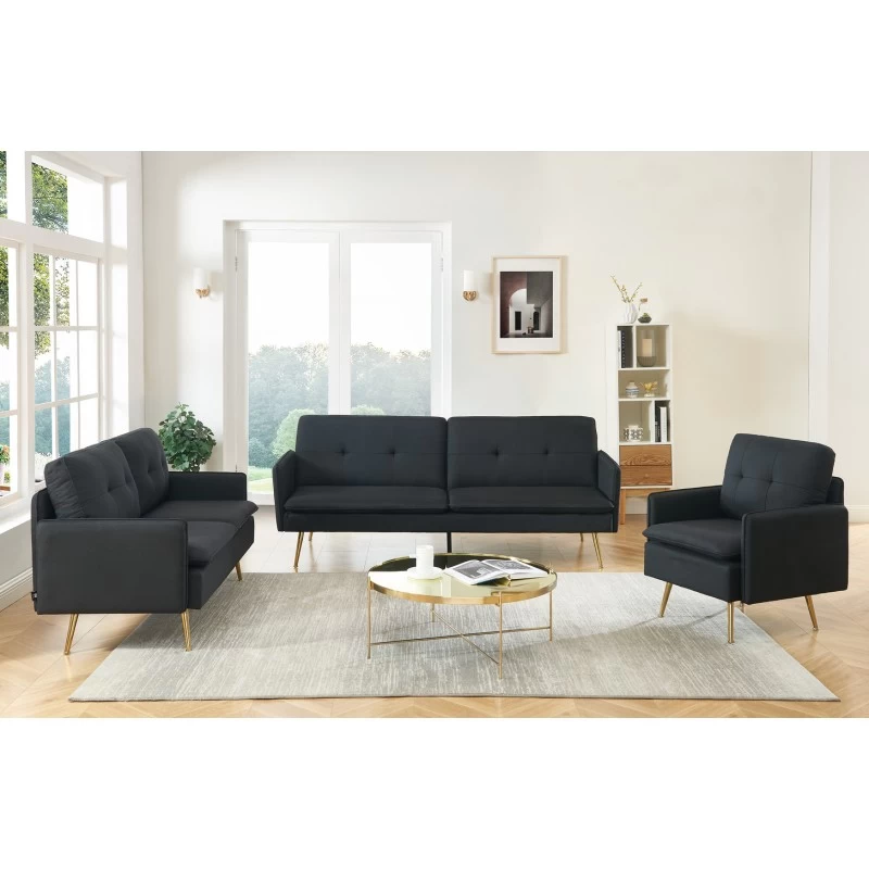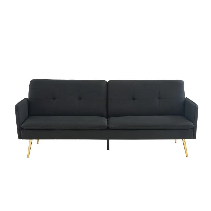 Avec son revêtement en tissu noir le canapé 3 places ADAM a tout pour plaire ! Son piètement très en vogue en métal doré apportera une touche d’élégance à votre intérieur. N’hésitez plus et laissez-vous séduire par l’association du tissu et du métal qui créeront une ambiance vintage. Son petit plus ? Sa fonction convertible pour accueillir vos invités de dernière minute.