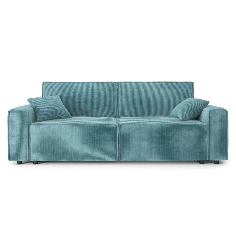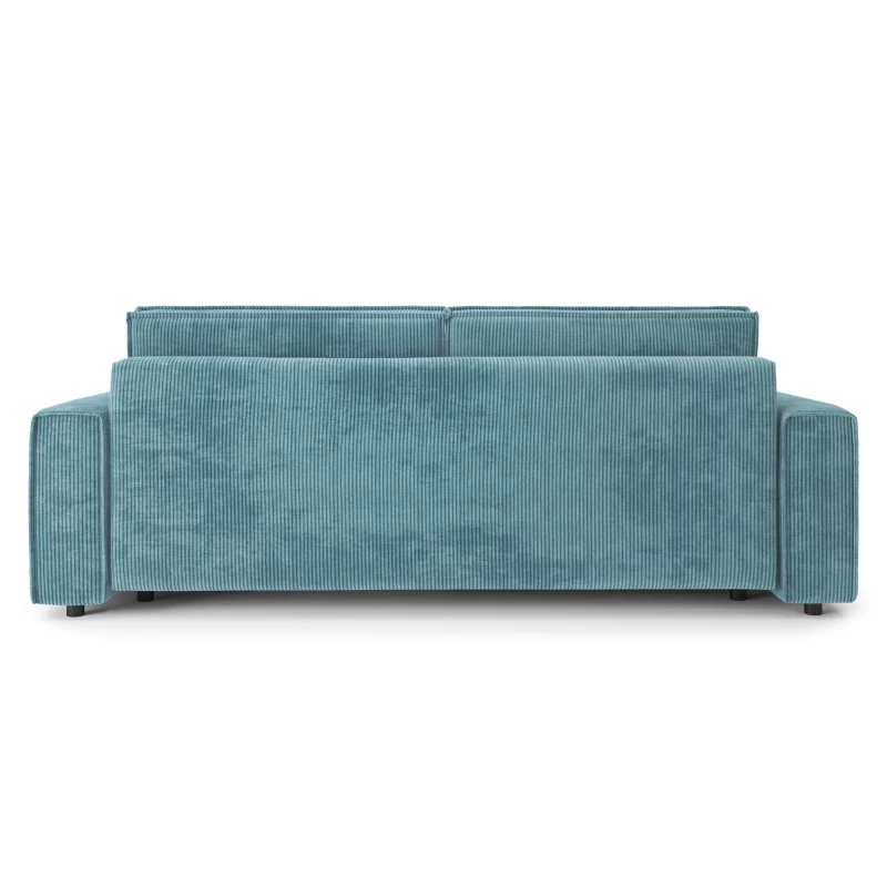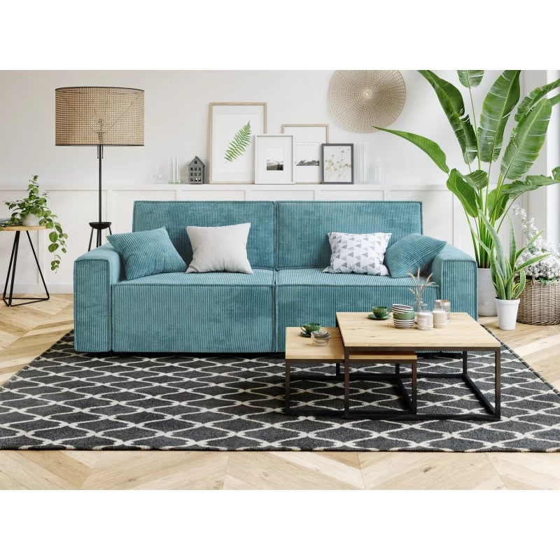 Son revêtement en velours côtelé, ses accoudoirs carrés et son format généreux sont ses vrais atouts tendance.