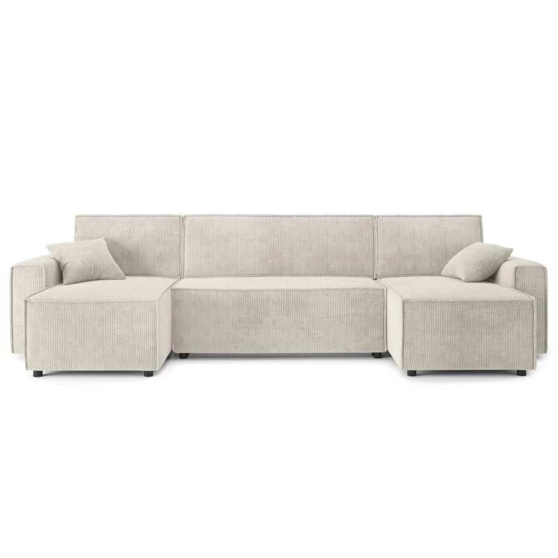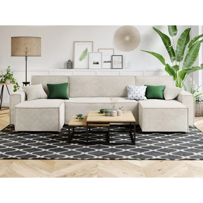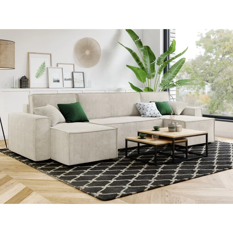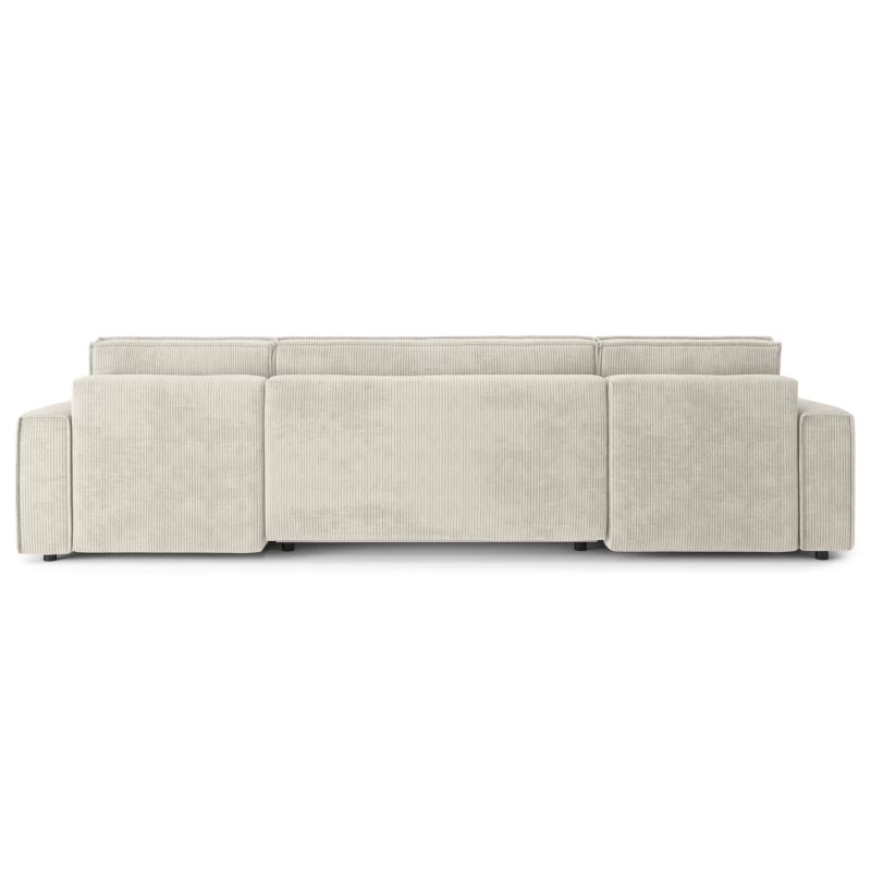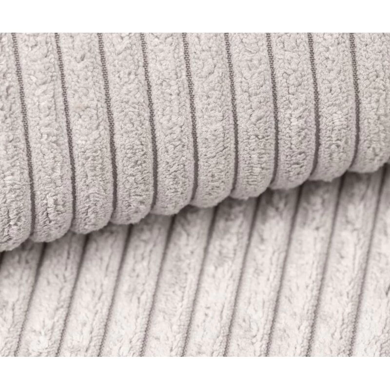 Son revêtement en velours côtelé beige, ses accoudoirs carrés et son format généreux sont ses vrais atouts tendance.