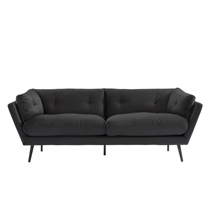 Doté d’une structure enveloppante, le canapé THELMA, moelleux et confortable, sera le compagnon idéal de vos moments de détente. Ses pieds compas noirs obliques et son armature assurent la robustesse de l’ensemble tout en conservant son esprit minimaliste. Avec son look élégant et placé dans votre salon à proximité d’une belle table basse aux lignes épurées, il sera le point d’orgue de votre décoration intérieure.