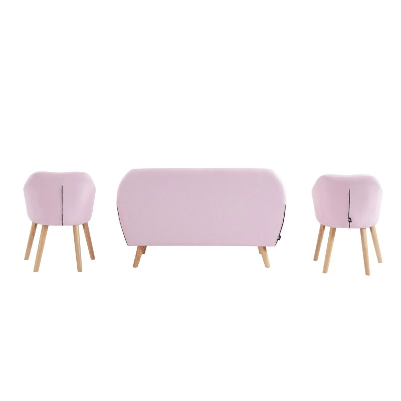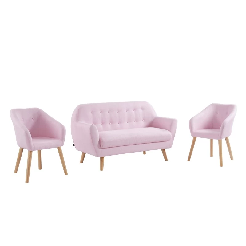 Ensemble composé d’un canapé HILDA 144 x 65 x 84 cm et de deux fauteuils HILDA 59 x 57 x 80 cm. Style scandinave. Pieds en bois d’hévéa. Revêtement en tissu rose.