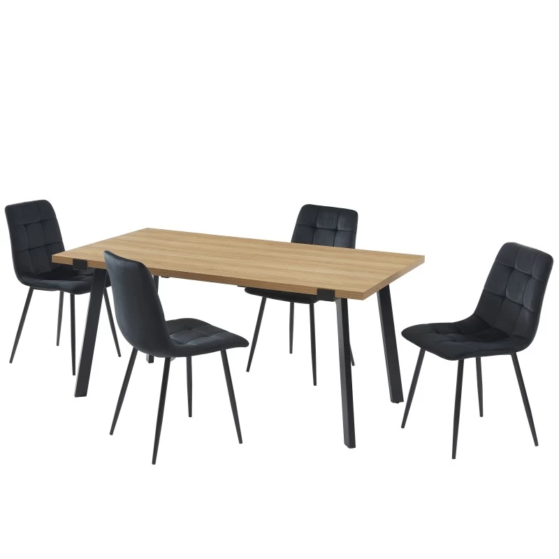Vous êtes à la recherche d’un ensemble table et chaises pour votre salle à manger ? Optez pour notre ensemble repas FELIX. Ces 4 chaises en velours apporteront chaleur et confort à votre intérieur. La table FELIX, de longueur 160cm, vous permettra d’accueillir vos convives ou de manger en famille dans un environnement spacieux ! On aime également ce style industriel chic, intemporel et qui s’accordera dans tout type d’intérieur.