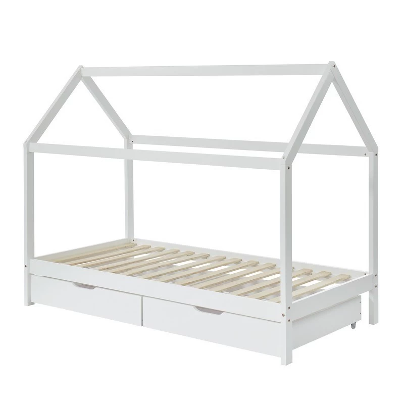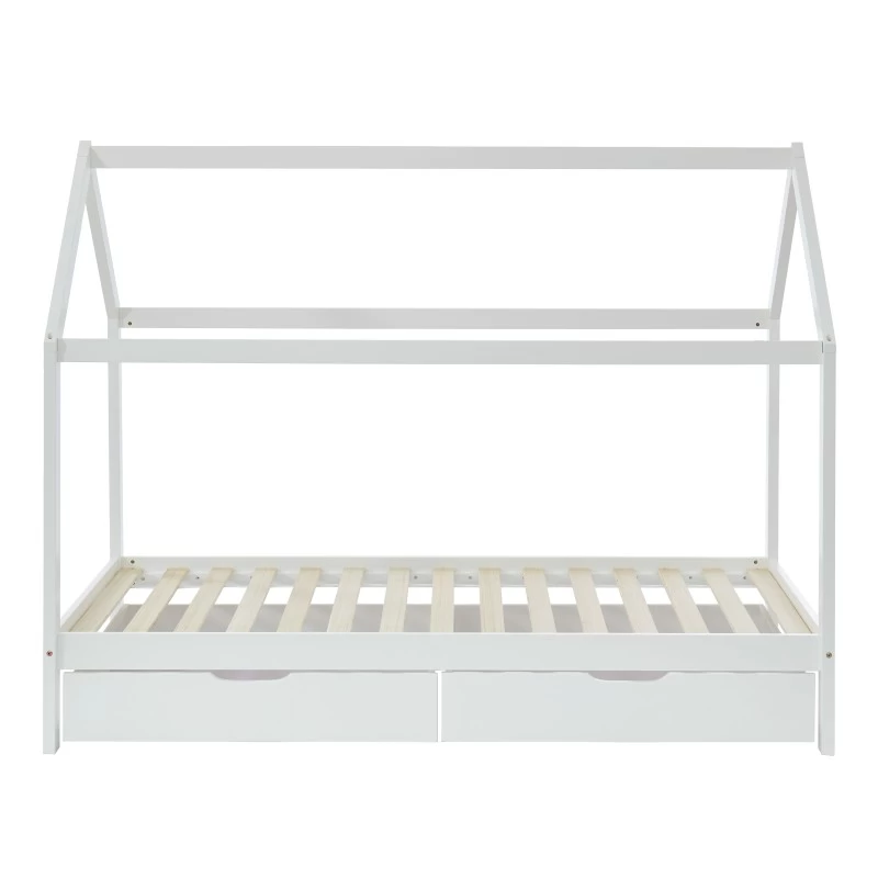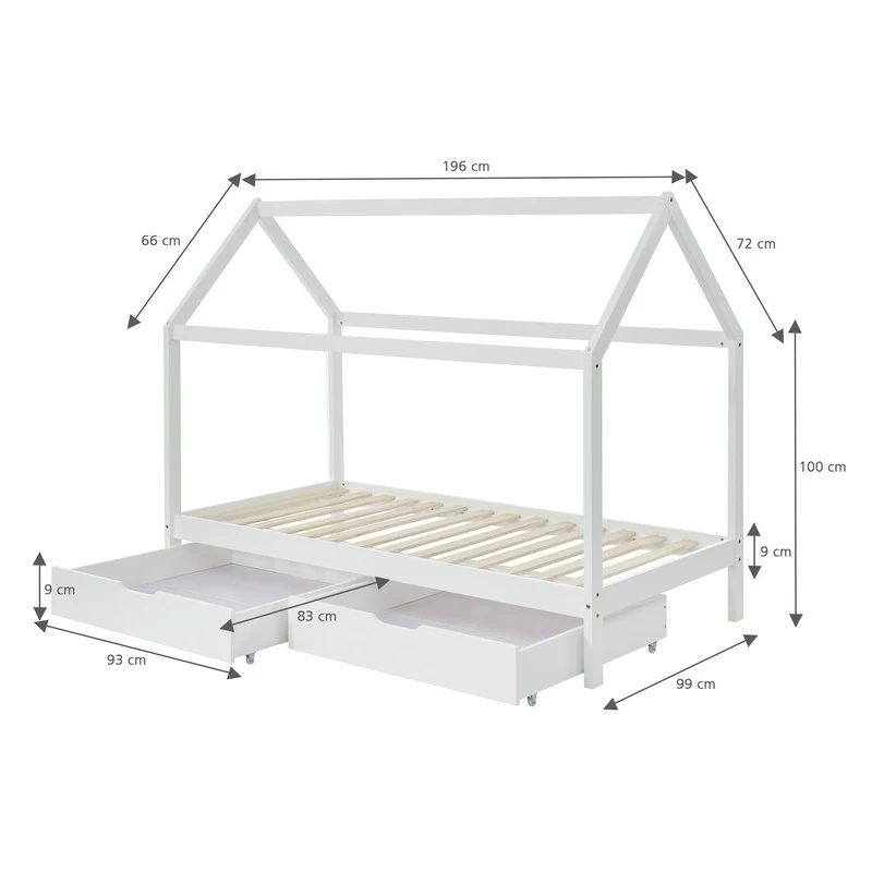 Lit enfant cabane à tiroirs TINY 90x190cm blanc – Structure en bois massif de pin – 2 tiroirs – Sommier inclus – Dimensions : L196 x P99 x H152cm