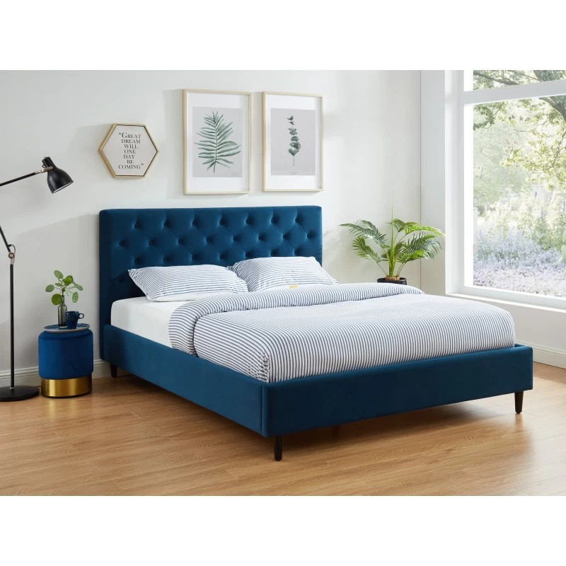 Lit Double HUBERT Velours Bleu Paon 160×200 Sommier Inclus