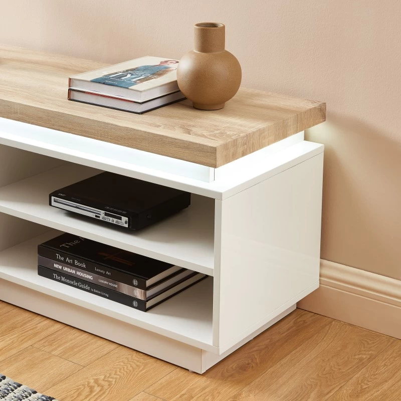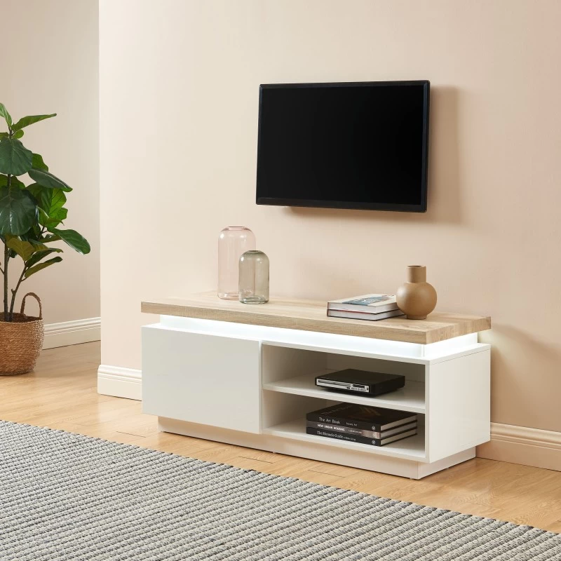 Pour finir, on tombe sous le charme de ce revêtement laqué blanc brillant, ainsi que de ce plateau effet chêne clair, donnant à ce meuble TV un style à la fois contemporain et naturel.