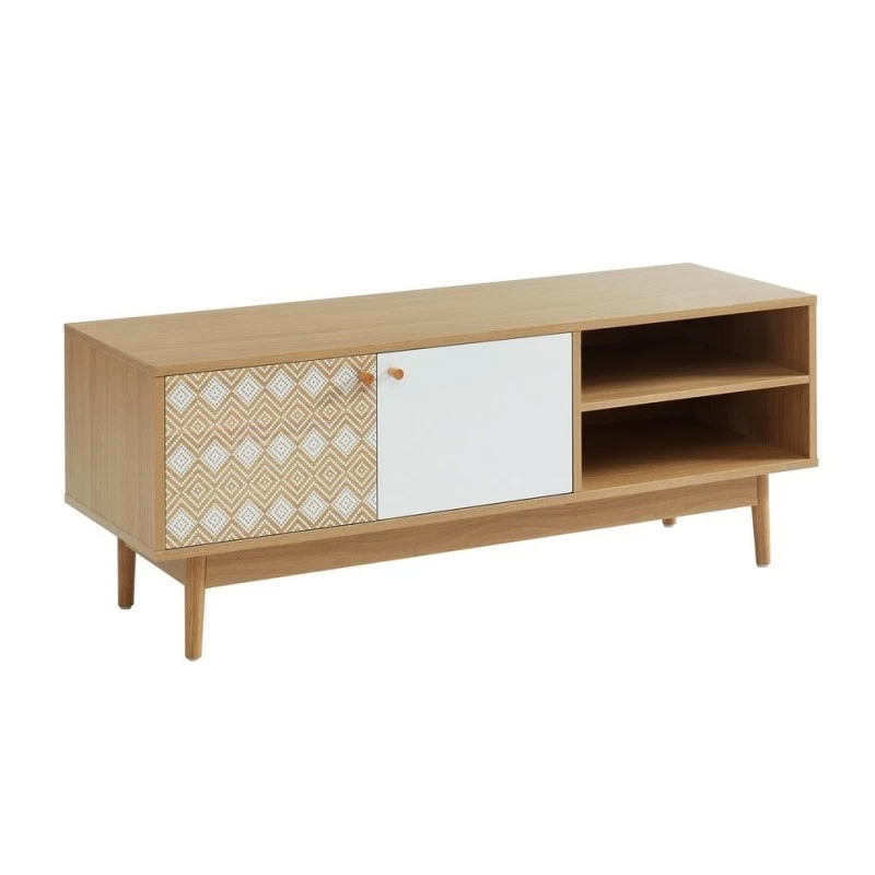Meuble TV LEIKA de style scandinave – Structure en panneau de particules – Finition papier 3D, coloris chêne – 1 porte blanche, 1 porte à motifs losanges et 2 niches de rangement – 4 pieds en bois massif d’eucalyptus – Dimensions : L120 x P39.5 x H45.5cm