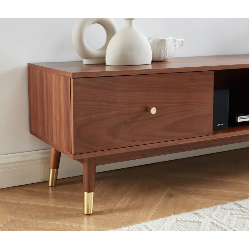 Meuble TV MARCELLO – Style vintage – 2 tiroirs – Structure en MDF – Revêtement en placage bois de noyer et mélaminé – Pieds en bois massif de noyer avec finition en laiton – Pieds avec patins en plastique – Poignées en laiton – Dimensions : L160 x P40 x H44cm.