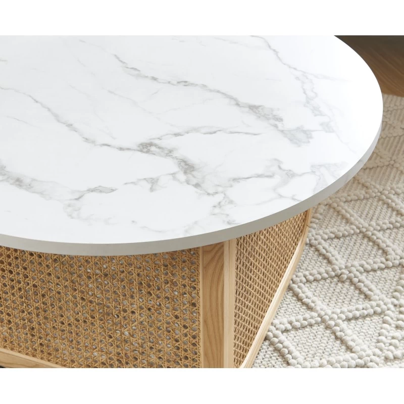 Table Basse LEON Effet Marbre Et Cannage Rotin 80cm