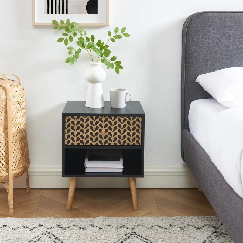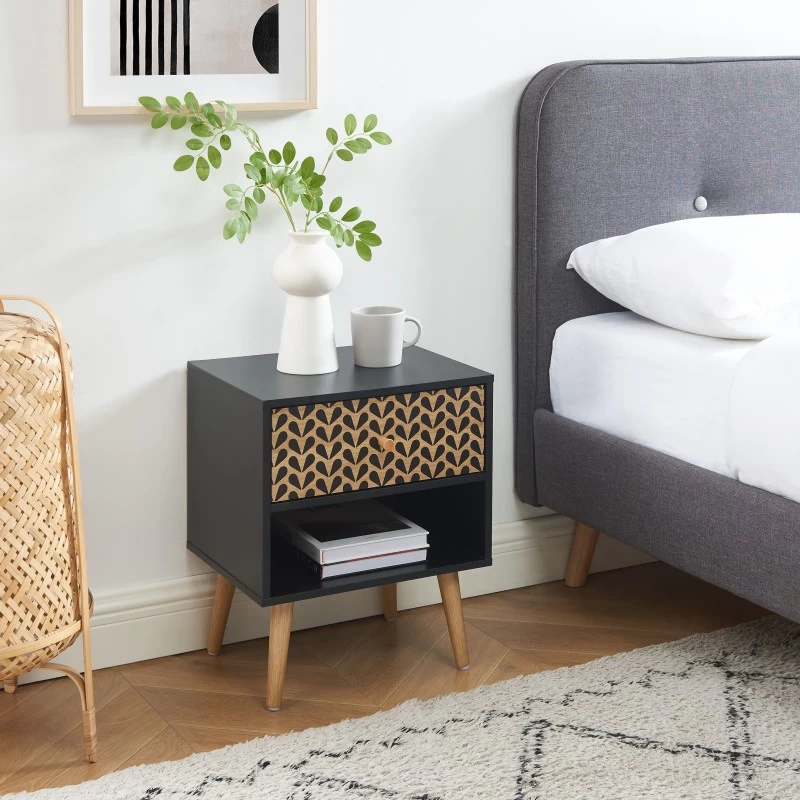 Ajoutez une touche d’originalité à votre chambre à coucher grâce à cette magnifique table de chevet CAPUCINE. D’un style rétro avec ses motifs délicats, mais aussi scandinave grâce à ses pieds évasés en bois massif, vous allez totalement craquer.