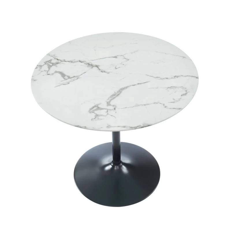 Table MONIKA 90cm – Style contemporain – Plateau en verre trempé effet véritable marbre – Piètement en métal laqué noir – Dimensions : D90 x H76cm